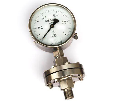 膜片壓力表的作用原理是基于彈性元件(測(cè)量系統(tǒng)上膜片)變形。膜片壓力表在被測(cè)介質(zhì)的壓力作用下,迫使膜片產(chǎn)生相應(yīng)的彈性變形---位移,借助連桿組經(jīng)傳動(dòng)機(jī)構(gòu)的傳動(dòng)并予放大,由固定于齒輪上的指針逐將被測(cè)值在度盤(pán)上指示出來(lái)。